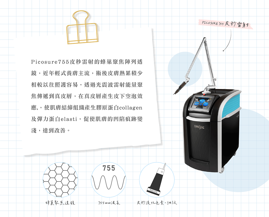 Picosure755皮秒雷射的蜂巢聚焦陣列透鏡,近年輕式養膚主流,術後皮膚熱累積少相較以往照護容易,透過光震波雷射能量聚焦傳遞到真皮層,在真皮層產生皮下空泡效應(Laser-Induced Optical Breakdown)